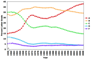 Un article fort intéressant tiré du blogue campusexplorer.com résume une recherche qui montre une augmentation du nombre de A donnés dans différentes institutions postsecondaires au États-Unis de 1940 à 2009. Cette recherche, tirée de la revue Teaching College Record est disponible, en partie, ici. Notons qu’aux États-Unis, on utilise principalement les lettres A, B, C, D et F (qui remplace le E dans les systèmes anglo-saxons), sans plus (+) et sans moins (-).